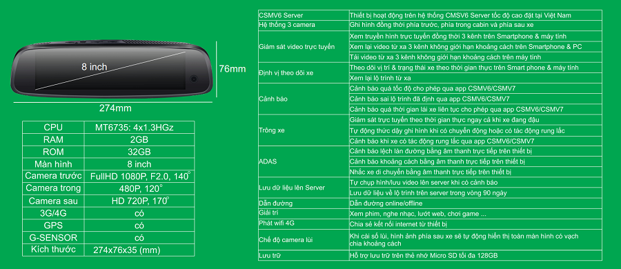 Navicom M79 plus là chiếc camera hành trình gương được trang bị cấu hình mạnh mẽ nhất trên thị trường hiện tại với 3 Camera, chíp xử lý MT6735, Ram 2Gb, bộ nhớ trong tới 32Gb, hỗ trợ khe cắm thẻ nhớ ngoài tới 128GB